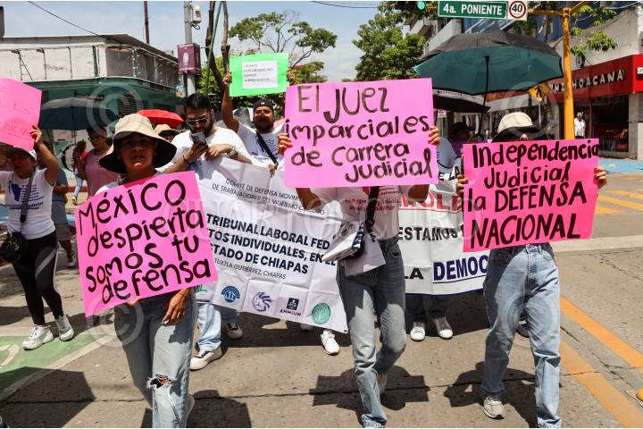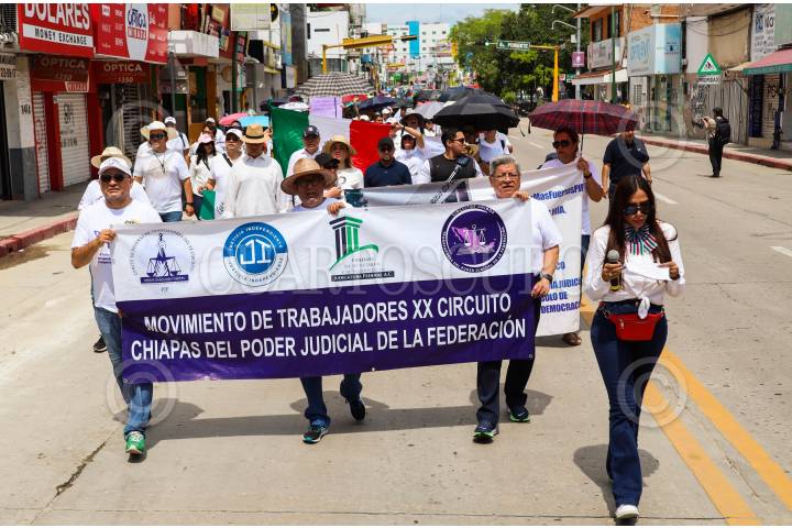 TUXTLA GUTIÉRREZ, 26AGOSTO2024.- Trabajadores del Poder Judicial federal en Tuxtla Gutiérrez se unieron a la marcha nacional contra la reforma al Poder Judicial propuesta por el Presidente de la República, Andrés Manuel López Obrador. Con playeras blancas, pancartas y consignas salieron este domingo a las calles de la capital para mostrar su descontento con tal propuesta, el contingente partió de l Parque Bicentenario y culminó a las afueras del Congreso del Estado. FOTO: ISABEL MATEOS /CUARTOSCURO.COM