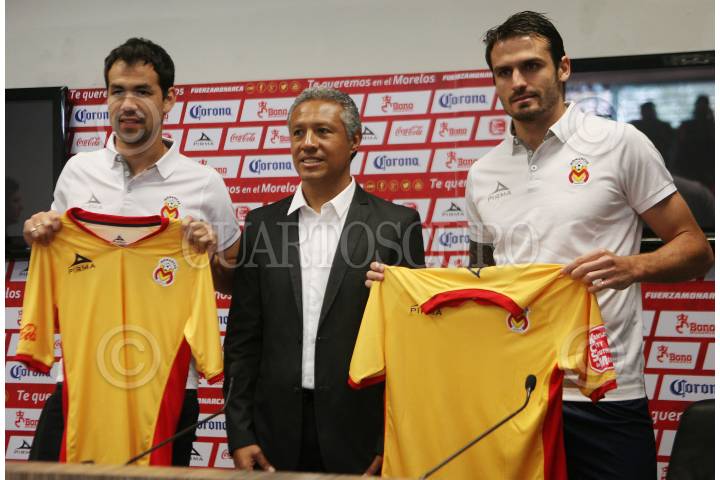 MORELIA, MICHOACÁN, 07JULIO2015.- El delantero paraguayo Pablo Velázquez y el defensa argentino Marco Torsiglieri fueron presentados este martes como los nuevos refuerzos de Monarcas Morelia para el año futbolístico que se avecina. La presentación estuvo a cargo del vicepresidente deportivo del club, Roberto Hernández. FOTO: ALAN ORTEGA /CUARTOSCURO.COM