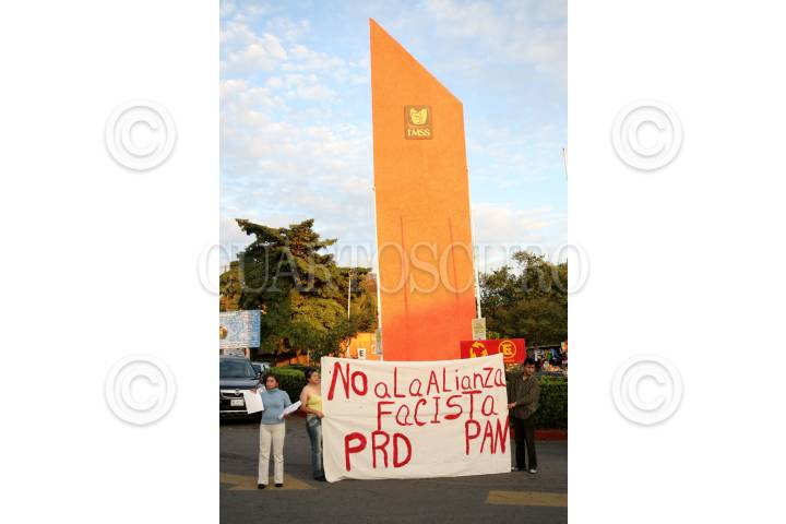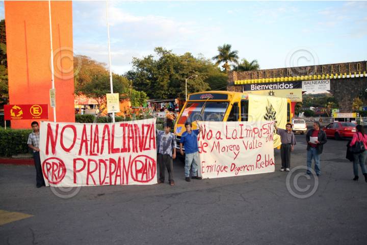 OAXTEPEC, MORELOS, 05DICIEMBRE2009.- Miembros del Movimiento de Izquierda Progresista de Puebla encabezado por Ricardo Jiménez Avila protestan con pancartas a la entrada del parque denominada 5 Arcos del Centro Vacional del IMSS, donde se efectúan las mesas de trabajos del PRD XII Congreso Refundación. Ahí informaron que están en total desacuerdo en la forma de como se conducen los trabajos y principalmente por la alianza que pretenden realizar la cúpula entre la derecha representada por el PRI y PAN. FOTO: MARCO POLO GUZMÁN HERNÁNDEZ/CUARTOSCURO.COM