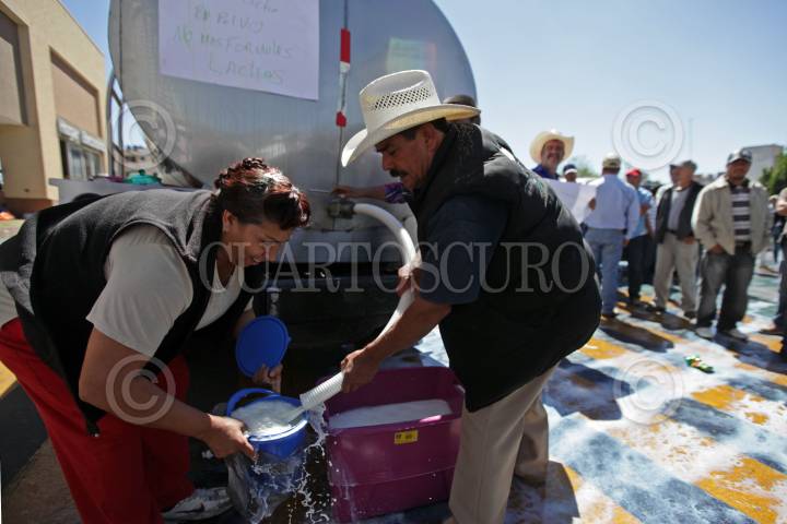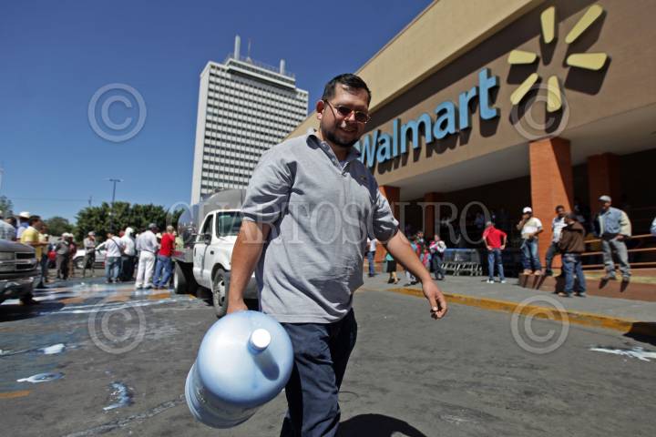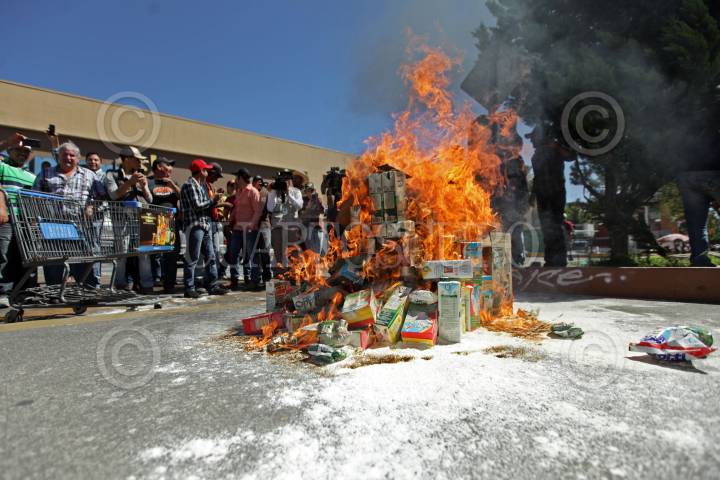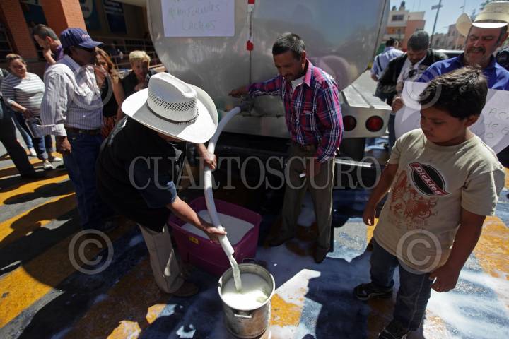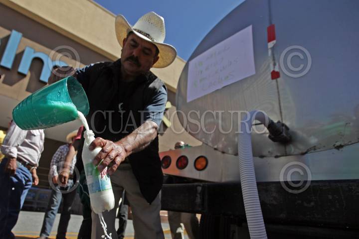 GUADALAJARA, JALISCO, 26FEBRERO2015.- En el estacionamiento de una tienda Walmart que se ubica cerca del centro de la ciudad, ganaderos de municipios de la Región Altos del estado, tiraron y regalaron alrededor de 5 mil litros de leche, también quemaron algunos productos de leches en polvo y sustitutos de la misma, esto en protesta por que las grandes empresas cada vez reducen mas el volumen de compra de su producto y este se queda rezagado en los establos, causa que provoca crisis en el sector. FOTO: FERNANDO CARRANZA GARCIA / CUARTOSCURO.COM
