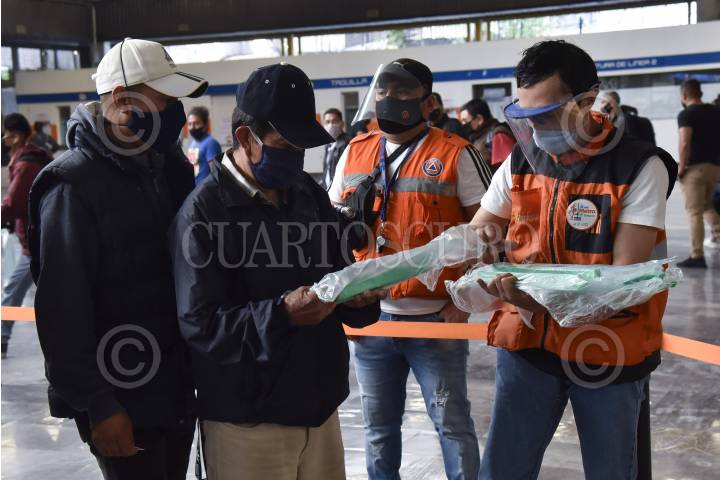 Trabajadores del Sistema de Transporte Colectivo (STC) Metro entregaron caretas gratuitas a usuarios que ingresaron a la estación Cuatro Caminos de la Línea 2. El objetivo es reducir la propagación de Covid-19 entre las personas mientras hacen uso del transporte público.