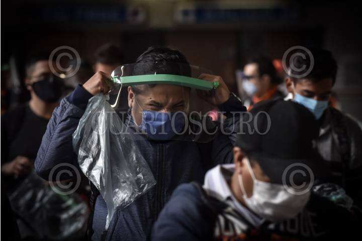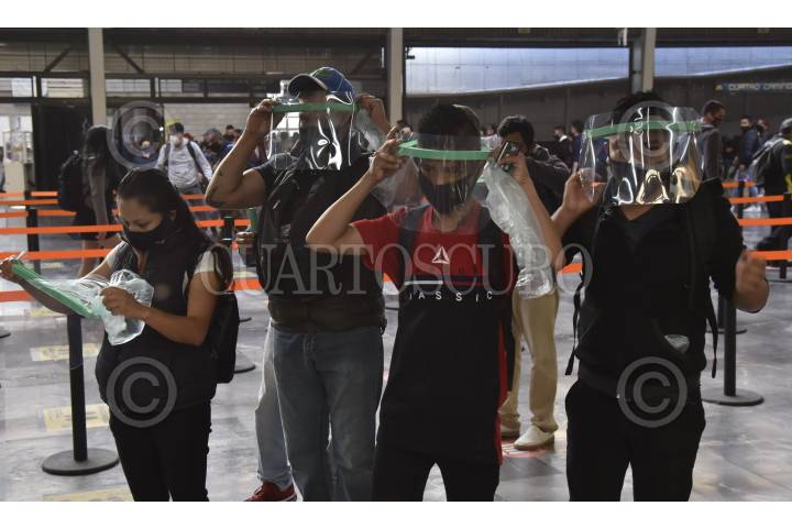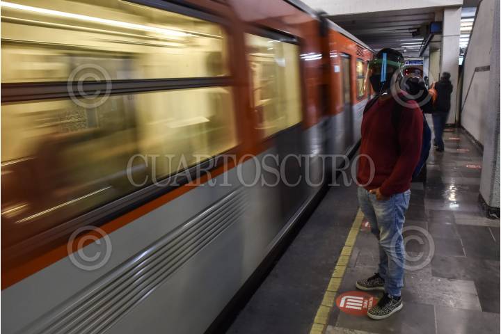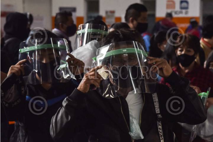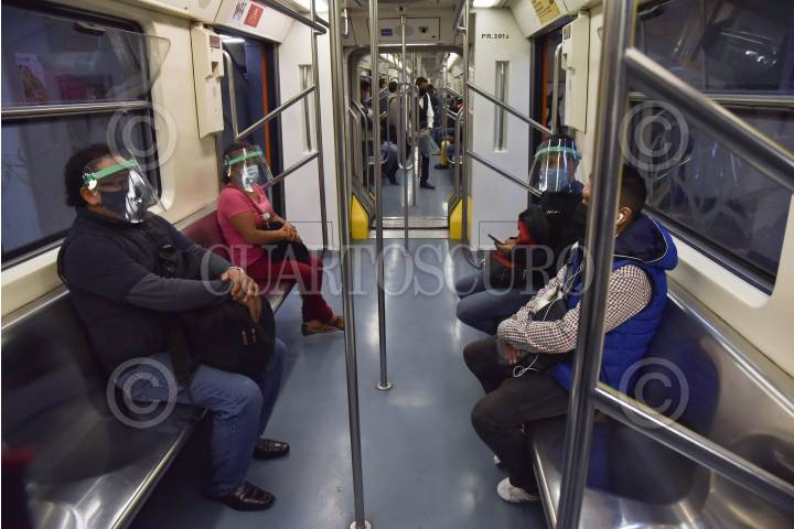 Usuarios del Sistema de Transporte Colectivo (STC) Metro usan caretas protectoras que recibieron de foto a gratuita en la estación Cuatro Caminos de la Línea 2. El objetivo es reducir la propagación de Covid-19 entre las personas mientras hacen uso del transporte público.