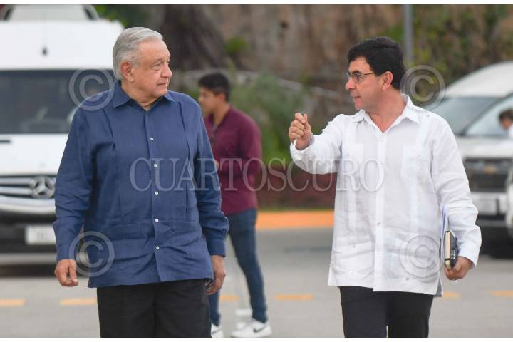 ACAPULCO, GUERRERO, 20DICIEMBRE2023.- Andrés Manuel López Obrador, presidente de México, y Jesús Ramírez Cuevas, Coordinador General de Comunicación Social y Vocero del Gobierno de la República, durante su llegada a la conferencia de prensa matutina realizada en la 12 Región Naval, en la que se mostraron los avances en la reconstrucción de Acapulco a 57 días del paso del huracán Otis. FOTO: MARIO JASSO/CUARTOSCURO.COM