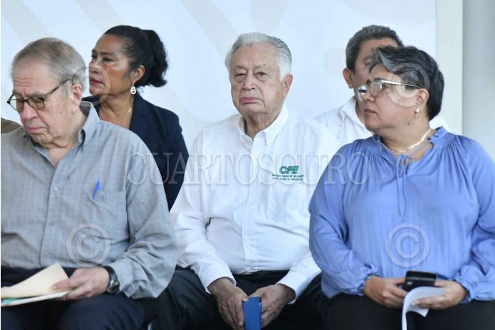ACAPULCO, GUERRERO, 20DICIEMBRE2023.- Manuel Bartlett, director general de la Comisión Federal de Electricidad (CFE), cuanto a Jorge Alcocer Varela, secretario de Salud y Raquel Buenrostro, secretaria de Economía, durante conferencia de prensa matutina realizada en la 12 Región Naval, en la que se mostraron los avances en la reconstrucción de Acapulco a 57 días del paso del huracán Otis. FOTO: MARIO JASSO/CUARTOSCURO.COM