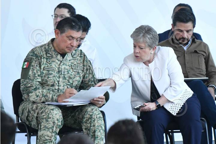 ACAPULCO, GUERRERO, 20DICIEMBRE2023.- Luis Cresencio Sandoval, secretario de la Defensa Nacional, y Alicia Bárcena secretaria de Relaciones Exteriores, durante conferencia de prensa matutina realizada en la 12 Región Naval, en la que se mostraron los avances en la reconstrucción de Acapulco a 57 días del paso del huracán Otis. FOTO: MARIO JASSO/CUARTOSCURO.COM