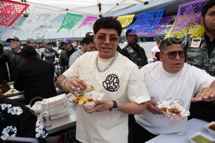 CIUDAD DE MÉXICO, 08ABRIL2025. Eduin Caz comparte con la prensa y sus compañeros una taquiiza al finalizar la conferencia de prensa con el grupo de regional mexicano Grupo Firme, anunciando sus dos fechas en el Estadio GNP para el proximo junio, donde presentarán su espectáculo "La Última peda Tour" asíi como el lanzamiento de su nuevo material discográfico titulado "Evolución ". FOTO: EDGAR NEGRETE LIRA/CUARTOSCURO.COM