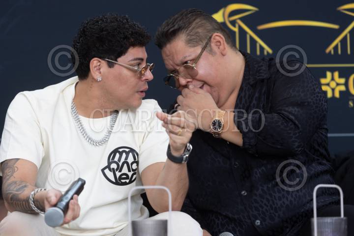 CIUDAD DE MÉXICO, 08ABRIL2025. Eduin Caz e Israel Gutiérrez durante la conferencia de prensa con el grupo de regional mexicano Grupo Firme, anunciando sus dos fechas en el Estadio GNP para el proximo junio, donde presentarán su espectáculo "La Última peda Tour" asíi como el lanzamiento de su nuevo material discográfico titulado "Evolución ". FOTO: EDGAR NEGRETE LIRA/CUARTOSCURO.COM