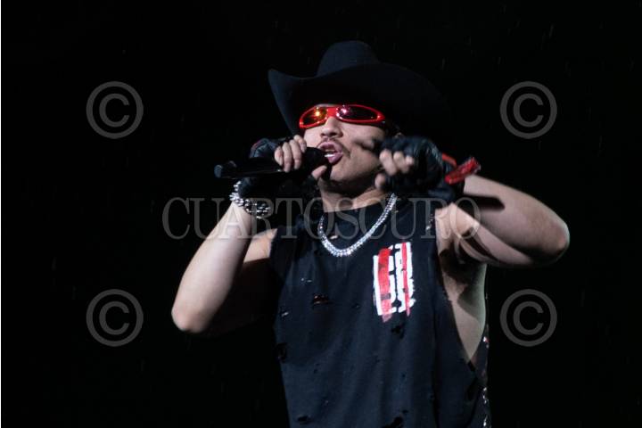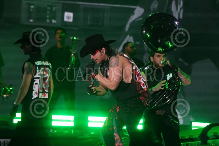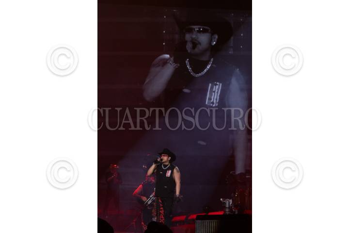 CIUDAD DE MÉXICO, 26JULIO2025. Jesús Ortíz Paz del grupo mexicoestadounidense de corridos tumbados y música sirreña, Fuerza Regida durante su presentación en el Estadio GNP con su espectáculo “Esto no es un Tour, México”. FOTO: EDGAR NEGRETE LIRA/CUARTOSCURO.COM
