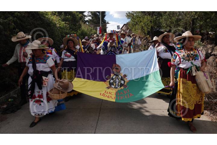 OCUMICHO, MICHOACÁNDEOCAMPO, 01FEBRERO2024.- Con música, ofrendas y danzas tradicionales, cientos de personas de las cuatro regiones purépechas (Región Ciénega, Región Lago, Región 11 pueblos y Sierra Meseta Purépecha) arribaron al zócalo de la comunidad de Ocumicho para celebrar ésta noche el Año Nuevo Purépecha. FOTO: GRACIELA LÓPEZ /CUARTOSCURO.COM