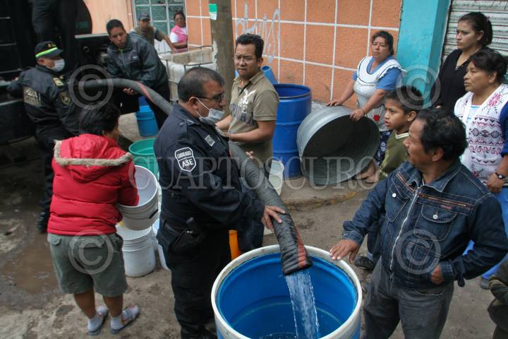 SAN ANDRES LA CAÑADA, ECATEPEC, ESTADO DE MÉXICO, 04NOVIEMBRE2009.- Elementos de la Policía Estatal (ASE) brindan el servicio de agua potable a la gente de las comunidades que se vieron afectadas tras las lluvias registradas el pasado viernes las cuales provocaron inundaciones en la zona. FOTO: ENRIQUE ORDÓÑEZ/CUARTOSCURO.COM