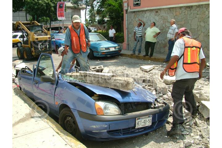 ACAPULCO, GUERRERO 27ABRIL2009.- El sismo registrado la tarde de hoy provoco el desprendimiento del techo de un edificio en Acapulco, cayendo encima de un automóvil dejando el perdida total FOTO: MARINO D. VALDEZ/CUARTOSCURO.COM