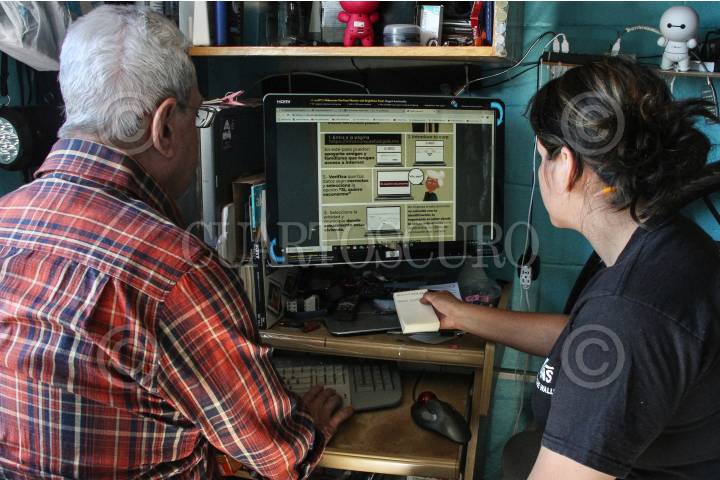 Nieta ayuda a su abuelo a realizar intento de registro para vacunación.