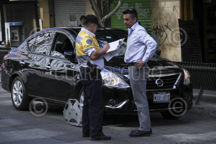 MÉXICO, D.F., 18DICIEMBRE2015.- Las multas por violar las normas del nuevo reglamento de tránsito continúan. En la imagen, un policía de tránsito autorizado para infraccionar coloca "la araña" para inmovilizar a una motocicleta que no estaba estacionada en el debido lugar. FOTO: MARÍA JOSÉ MARTÍNEZ /CUARTOSCURO.COM