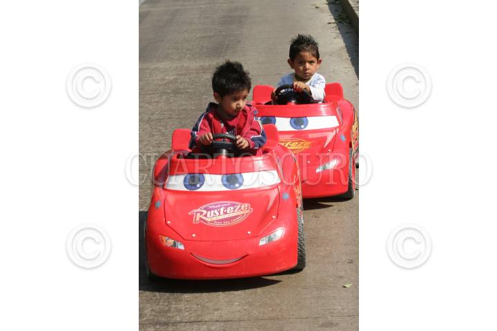 MÉXICO, D.F., 11ENERO2009.- Cientos de personas acuden a la Avenida Paseo de la Reforma para salir con su bicicleta y ejercitarse, durante el programa denominado Ciclotón. En la imagen dos niños rompen las reglas del cicloton ya que para trasportase ocuparon sus autos eléctricos. FOTO: RICARDO CASTELAN/CUARTOSCURO.COM