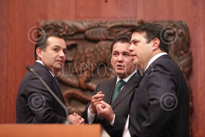 CIUDAD DE MÉXICO, 16NOVIEMBRE2017.- El presidente del Senado, Ernesto Cordero, conversa con los senadores del Partido Verde; Carlos Alberto Puente Salas y Juan Gerardo Flores, durante la sesión en al que se aprobó las reglas para designar al nuevo titular de la Fepade. FOTO: SENADO /CUARTOSCURO.COM