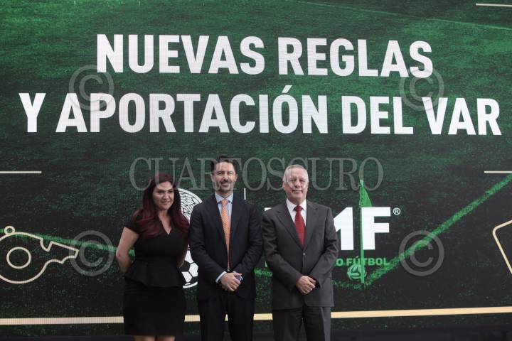 TOLUCA, ESTADO DE MÉXICO, 26JUNIO2019.- Beatriz Ramos, Directora de Comunicación e Imagen, Yon de Luisa, Presidente de FEMEXFUT y Arturo Brizio, Presidente de la Comisión de Árbitros durante la presentación de las Nuevas Reglas y Aportación del VAR ante medios de comunicación en las instalaciones de la Federación Mexicana de Fútbol Asociación A. C. FOTO: CRISANTA ESPINOSA AGUILAR /CUARTOSCURO.COM