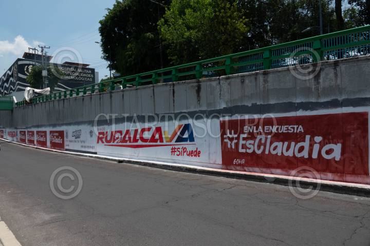 Bardas publicitarias con el nombre de Claudia Sheinbaum y Adrián Rubalcava. Todas las vallas publicitarias de los aspirantes a candidatura tendrán que ser modificadas o de lo contrario se sumarán a gastos de precampaña de acuerdo con las reglas del IN