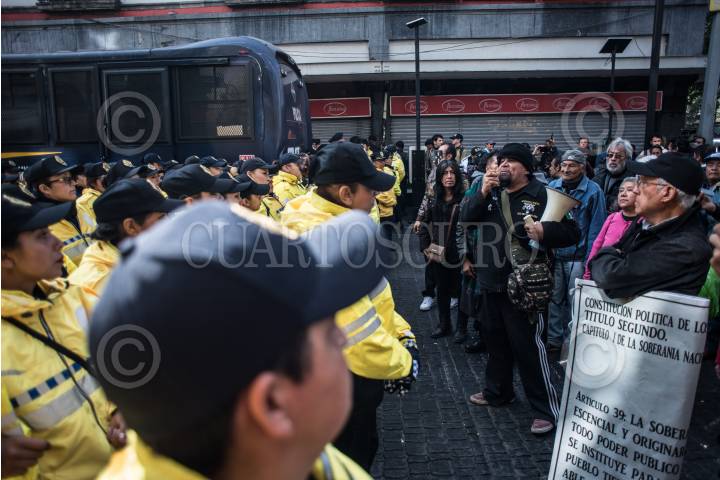 CIUDAD DE MÉXICO, 02ENERO2019.- Un grupo de manifestantes encara a elementos de la Secretaría de Seguridad Pública de la Ciudad de México, quienes resguardan uno de lo accesos a la Suprema Corte de Justicia de la Nación (SCJN), donde se lleva acabo la toma de protesta del nuevo Ministro Presidente de la SCJN. FOTO: MISAEL VALTIERRA /CUARTOSCURO.COM