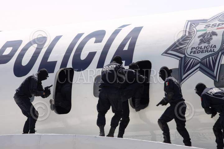 MÉXICO, D.F., 26MARZO2009.- El grupo de operaciones especiales de la Policía Federal realizaron una demostración de intervención en un simulacro de toma de rehenes en el interior de un avión, durante el recorrido que realizó Hillary Clinton, Secretaría de Estado Norteamericana, en el Centro de Alto Mando de la PFP, esto la delegación Iztapalapa. FOTO: MOISÉS PABLO/CUARTOSCURO.COM