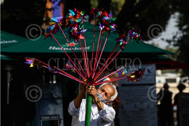 Vendedor de rehiletes alista su producto a un costado del Parque Hidalgo en el Centro de Coyoacán. FOTO: ROGELIO MORALES /CUARTOSCURO.COM