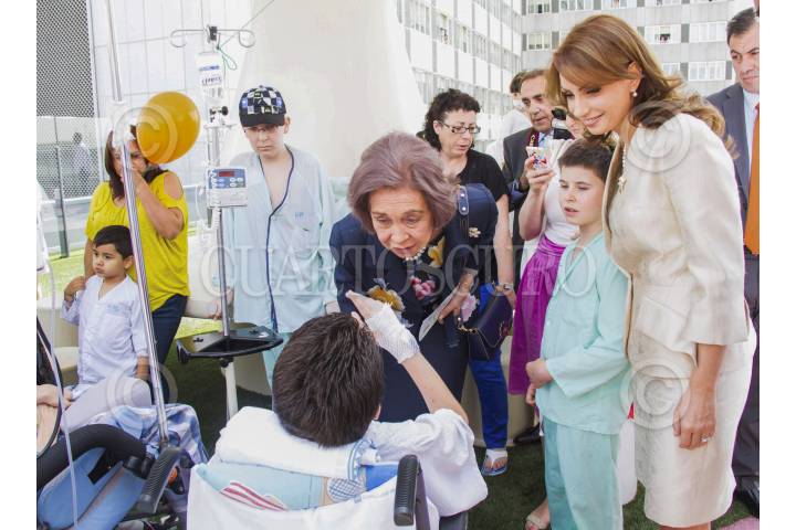 MADRID, ESPAÑA, 10JUNIO2014.- La Reina Doña Sofía de España acompañada de Angélica Rivera de Peña, esposa del presidente de México, recorrieron la sección Materno-Infantil del Hospital Universitario La Paz donde saludaron a los pequeños pacientes y personal que ahí labora. FOTO: PRESIDENCIA /CUARTOSCURO.COM