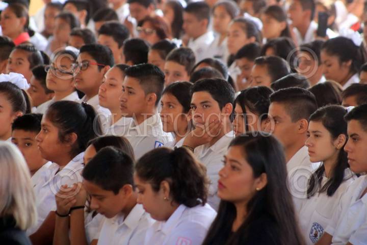 CUERNAVACA, MORELOS, 27MAYO2019.- Cuauhtémoc Blanco Bravo, gobernador de Morelos, durante el evento de reinauguración de la secundaria número 14, la cual fue afectada por el sismo del 19 de septiembre del 2017. En la imagen estudiantes escuchan el discurso de las autoridades. FOTO: MARGARITO PÉREZ RETANA /CUARTOSCURO.COM