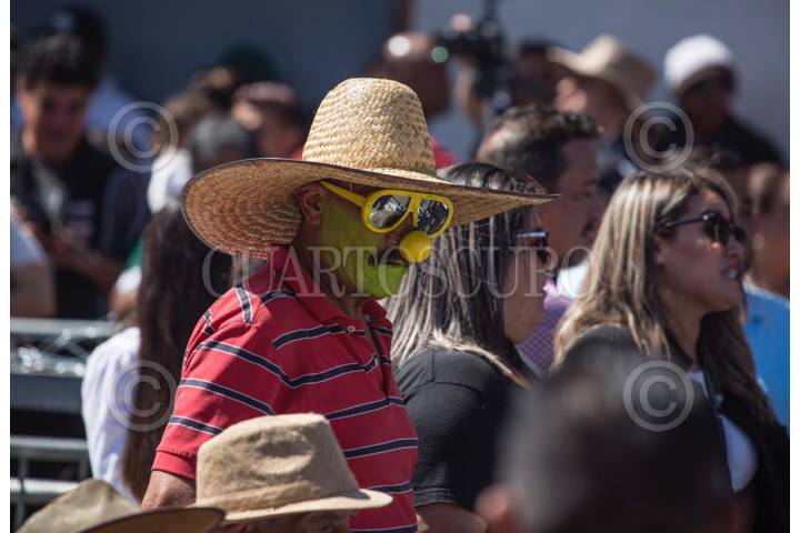 TIJUANA, BAJA CALIFORNIA, 08JUNIO2019.- El presidente de la República, Andrés Manuel López Obrador encabezará celebración por el acuerdo alcanzado con Estados Unidos que evita la imposición de aranceles a productos mexicanos. El mitin se realizará en la Zona Centro de la ciudad Fronteriza. Desde temprana hora decenas de simpatizantes se comenzaron a reunir previo al evento. En la imagen simpatizante llega disfrazado. FOTO: OMAR MARTÍNEZ /CUARTOSCURO.COM