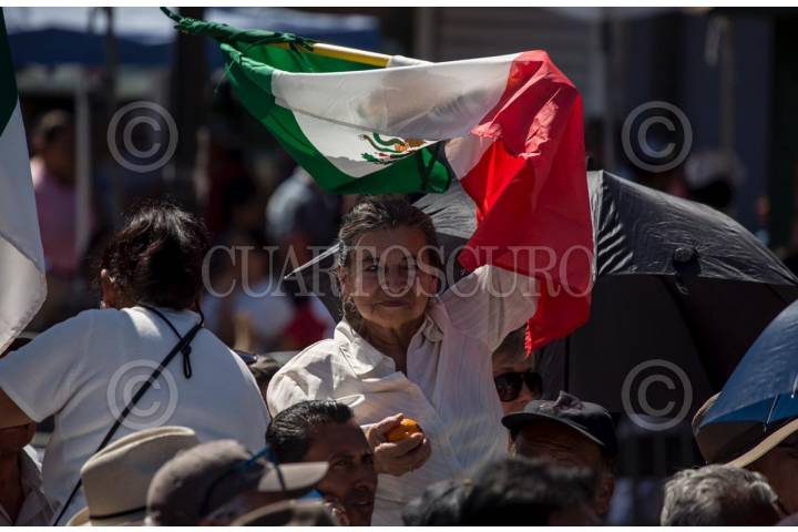 TIJUANA, BAJA CALIFORNIA, 08JUNIO2019.- El presidente de la República, Andrés Manuel López Obrador encabezará celebración por el acuerdo alcanzado con Estados Unidos que evita la imposición de aranceles a productos mexicanos. El mitin se realizará en la Zona Centro de la ciudad Fronteriza. Desde temprana hora decenas de simpatizantes se comenzaron a reunir previo al evento. En la imagen simpatizante de tercera edad, llega desde temprana hora con bandera de México. FOTO: OMAR MARTÍNEZ /CUARTOSCURO.COM