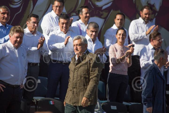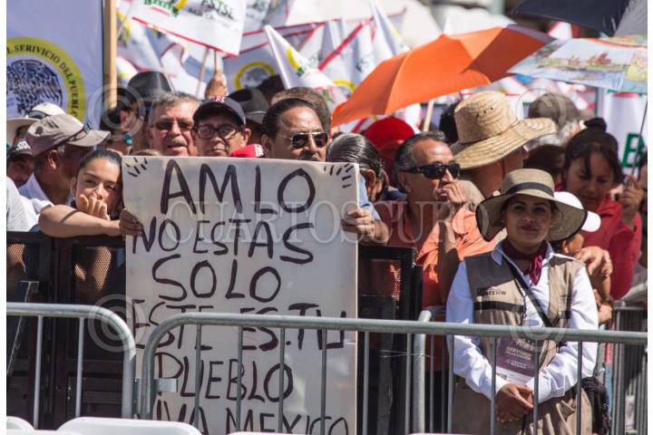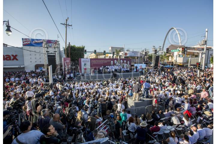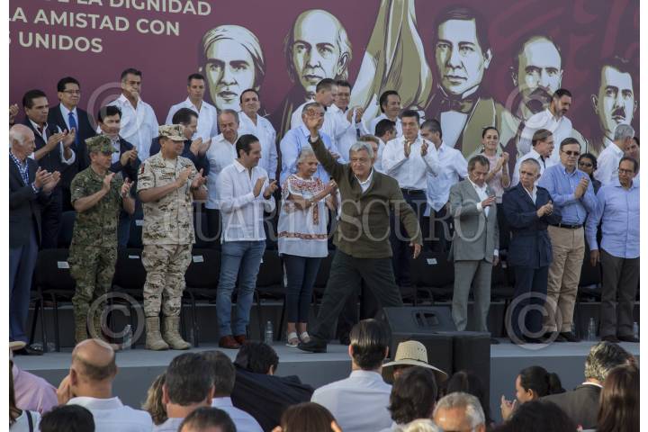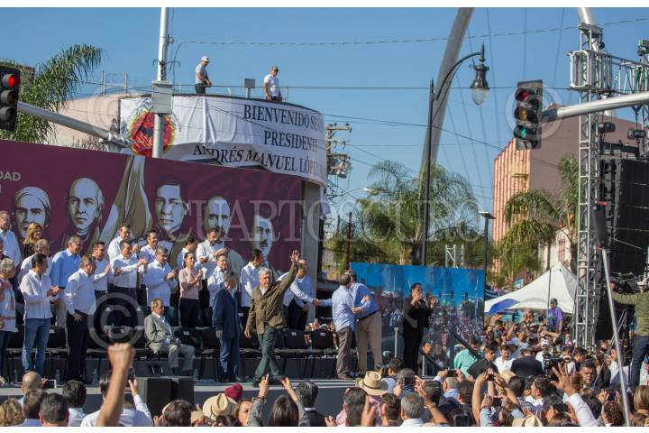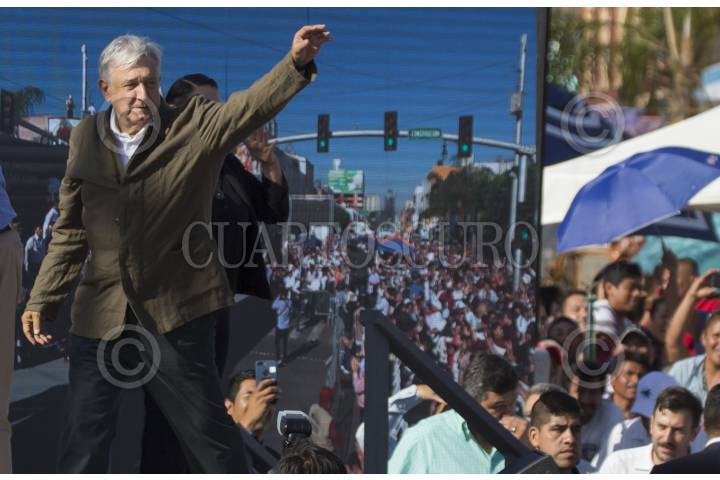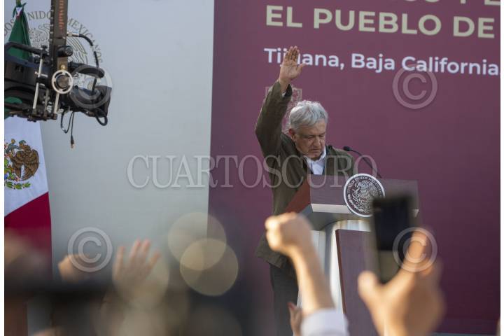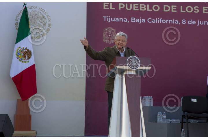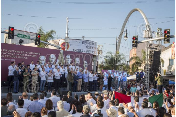 TIJUANA, BAJA CALIFORNIA, 08JUNIO2019.- El presidente de la República, Andrés Manuel López Obrador, durante la celebración por el acuerdo alcanzado con Estados Unidos que evita la imposición de aranceles a productos mexicanos. El mitin se realiza en la Zona Centro de la ciudad Fronteriza. Desde temprana hora cientos de simpatizantes se comenzaron a reunir previo al evento. FOTO: OMAR MARTÍNEZ /CUARTOSCURO.COM