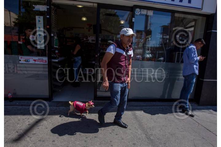 TIJUANA, BAJA CALIFORNIA, 08JUNIO2019.- El presidente de la República, Andrés Manuel López Obrador encabezará celebración por el acuerdo alcanzado con Estados Unidos que evita la imposición de aranceles a productos mexicanos. El mitin se realizará en la Zona Centro de la ciudad Fronteriza. Desde temprana hora decenas de simpatizantes se comenzaron a reunir previo al evento. En la imagen simpatizante llega con su mascota vestido con el logo del partido político Morena. FOTO: OMAR MARTÍNEZ /CUARTOSCURO.COM