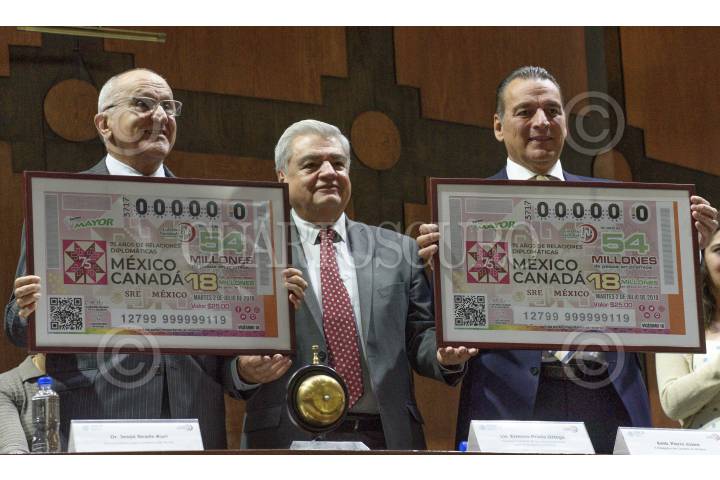 CIUDAD DE MÉXICO, 02JULIO2019.- Jesús Seade Kuri, Subsecretario para América del Norte; Ernesto Prieto Ortega, Director General de la Lotería Nacional para la Asistencia Pública, y Pierre Alarie, embajador de Canadá en México, encabezaron esta noche el sorteo mayor de la Lotería Nacional conmemorativo al 75 aniversario de Relaciones Diplomáticas entre México y Canadá. FOTO: MARIO JASSO /CUARTOSCURO.COM
