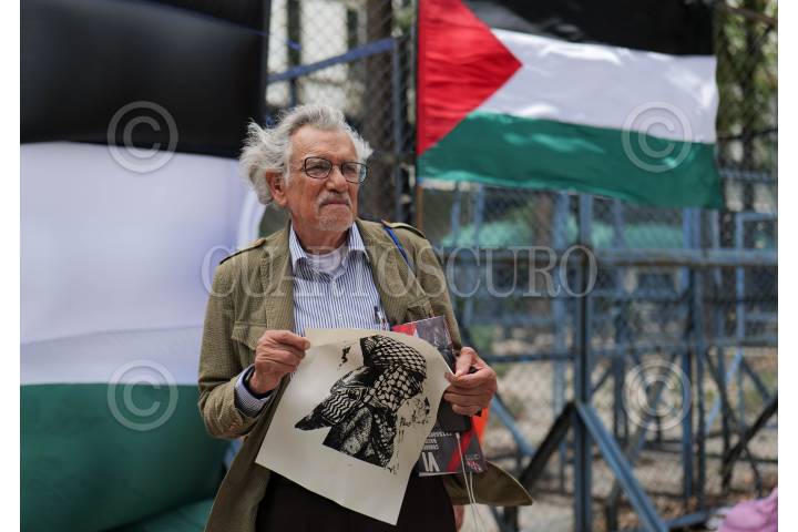 CIUDAD DE MÉXICO, 21JUNIO2024.- Un hombre sostiene un cartel en el que se muestra a una persona llevando un "kufiya", durante una protesta en favor de Palestina frente a la Embajada de Estados Unidos. FOTO: ALICE MORITZ/CUARTOSCURO.COM