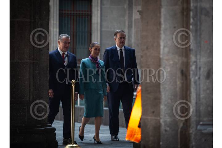 CIUDAD DE MÉXICO, 15OCTUBRE2024.- Claudia Sheinbaum Pardo, presidenta de México acompañada de Marcelo Ebrard Casaubón, secretario de economía y Francisco Alberto Cervantes, presidente del consejo Coordinador Empresarial (CCE) durante conferencia de prensa en Palacio Nacional después de reunión con empresarios de Estados Unidos. FOTO: ANDREA MURCIA /CUARTOSCURO.COM