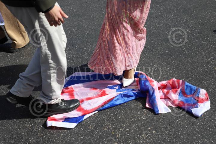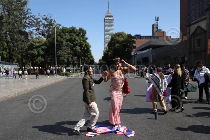 CIUDAD DE MÉXICO, 14NOVIEMBRE2024.- Dos personas bailan sobre una bandera de Israel durante una protesta pro Palestina. FOTO: DANIEL AUGUSTO/ CUARTOSCURO.COM