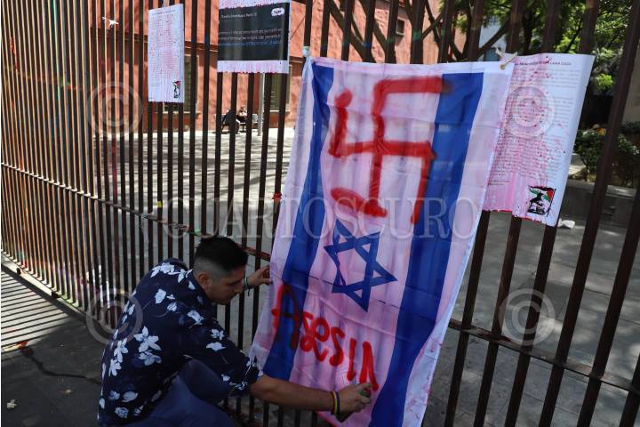 CIUDAD DE MÉXICO, 14NOVIEMBRE2024.- Una bandera de Israel bañada en pintura roja, asemejando la sangre, fue colocada frente al Museo de Memoria y Tolerancia. FOTO: DANIEL AUGUSTO/ CUARTOSCURO.COM