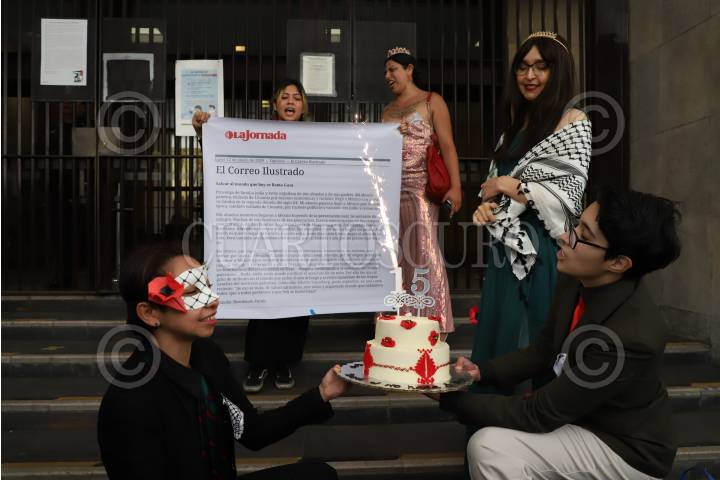 CIUDAD DE MÉXICO, 14NOVIEMBRE2024.- Activistas pro Palestina se manifestaron afuera de la Secretaría de Relaciones Exteriores, esto debido a que se cumplieron 15 años de que la actual presidenta de México, Claudia Sheinbaum, escribiera una carta donde recriminaba las acciones del estado de Israel en territorio palestino y dicha carta fuera publicada en el periódico La Jornada, los manifestantes solicitan a la mandataria mexicana actúe descuerdo a lo que escribió en ese entonces y que el país rompa relaciones con Israel. FOTO: DANIEL AUGUSTO/ CUARTOSCURO.COM