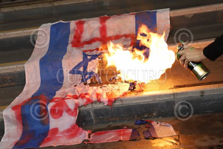 CIUDAD DE MÉXICO, 14NOVIEMBRE2024.- Una bandera de Israel es quemada frente a la oficinas de la Secretaria de Relaciones Exteriores por parte de activistas pro Palestina. FOTO: DANIEL AUGUSTO/ CUARTOSCURO.COM
