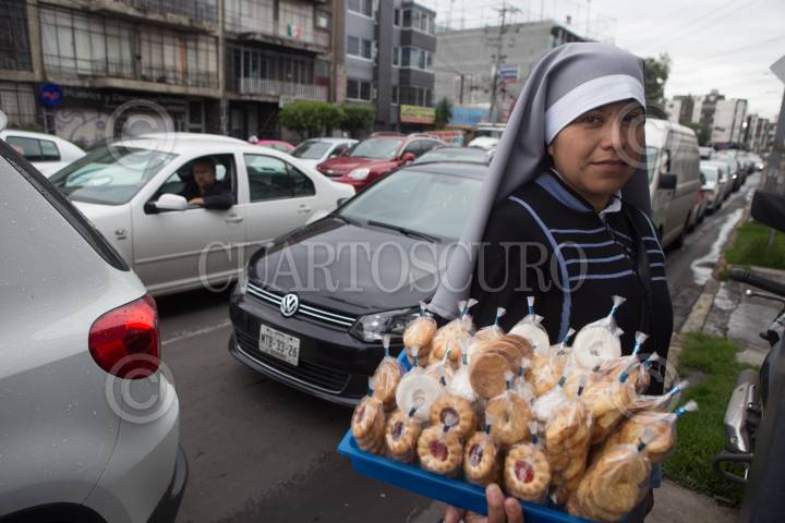 CIUDAD DE MÉXICO, 19JUNIO2018.- Una monja vende galletas en un semáforo de la capital mexiquense. FOTO: TERCERO DÍAZ /CUARTOSCURO.COM