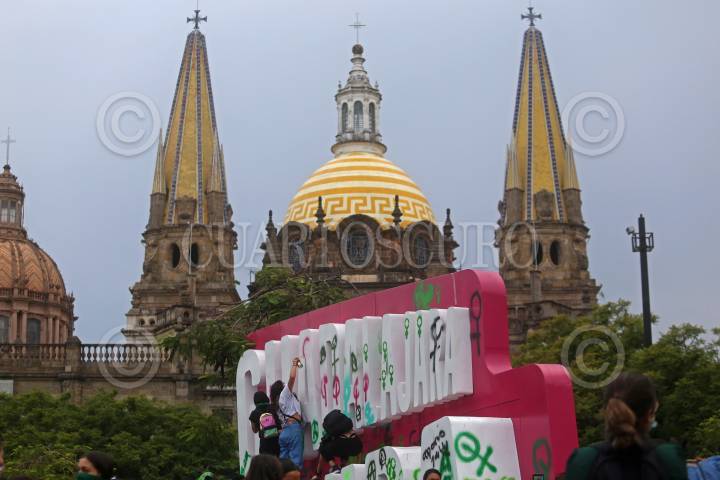 Algunas feministas realizan pintas esta tarde durante la marcha por la Despenalización del Aborto Gdl #28s, en el centro de la ciudad de Guadalajara.
