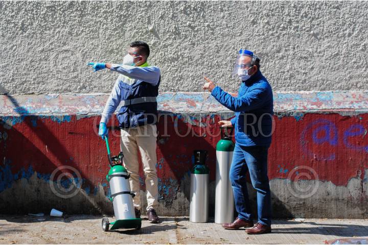 Personas asisten al Centro de Rehabilitación Infantil de la Alcaldía Gustavo A. Madero para rellenar de forma gratuita sus tanques para oxígeno médico.