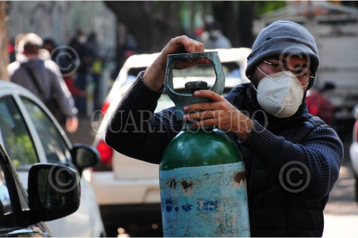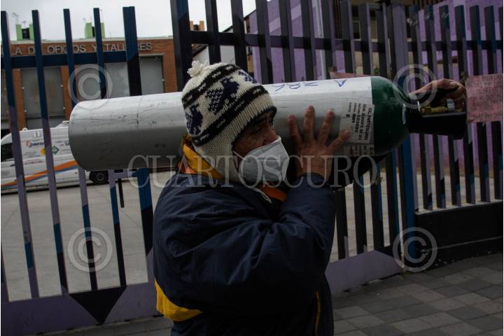 Un hombre sale con su tanque de oxígeno rellenado, a lado suyo decenas de personas esperan su turno para poder llenar de nueva cuenta su tanque.