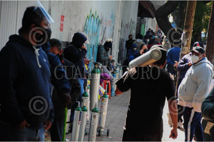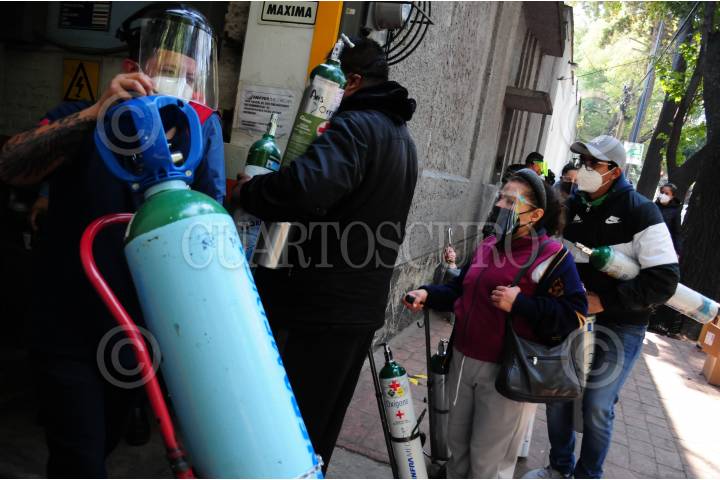 Personas de distintos puntos de la capital y del Estado de México asisten desde muy temprano a las instalaciones de Infra para rellenar sus tanques de oxígeno.