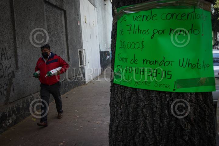 Una persona camina a lado de un letrero de venta de gas médico al exterior sobre la calle comercio de la colonia Escandón.
