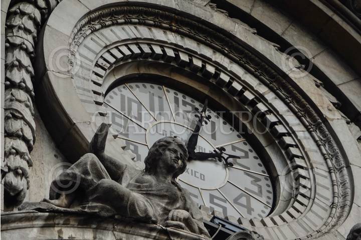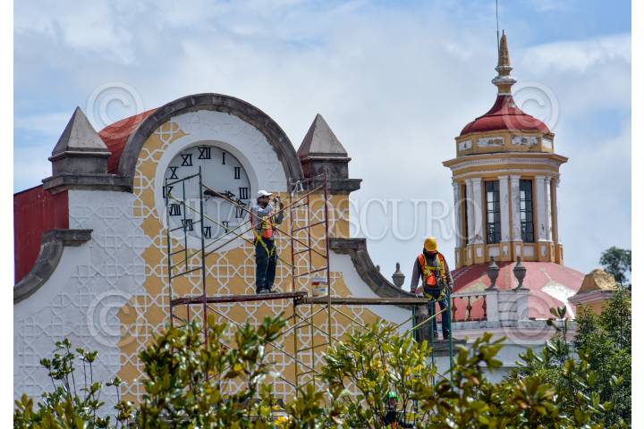 Trabajadores pintan la fachada de la Secundaria número 1 Miguel Hidalgo en Toluca, cuidando el reloj que se encuentra en esta institución.