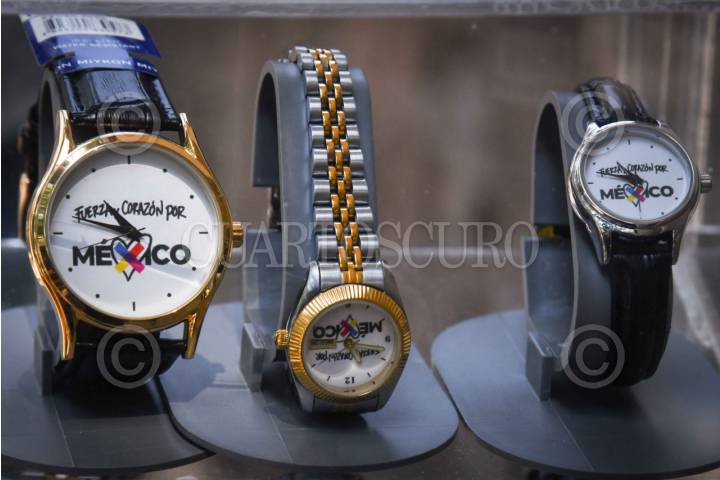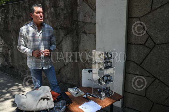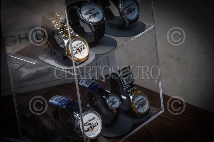 CIUDAD DE MÉXICO, 25ABRIL2024.- Felipe Armenta, comerciante independiente pone a la venta relojes con la leyenda "Fuerza y corazón por México" (coalición: PAN, PRI y PRD) al exterior de la casa donde la candidata presidencial Xóchitl Gálvez, realiza su conferencia "Sin miedo a la verdad". Los relojes de la marca Swanson y Mykon van de los 550 a los 750 pesos. FOTO: MARIO JASSO/CUARTOSCURO.COM