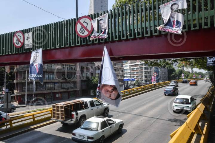 CIUDAD DE MÉXICO, 25ABRIL2024.- Propaganda electoral dañada de Miguel Torruco, candidato a la alcaldía de Miguel Hidalgo, sobre un puente de la colonia Anzures. FOTO: MARIO JASSO/CUARTOSCURO.COM