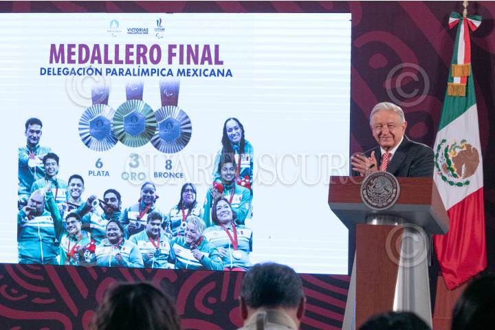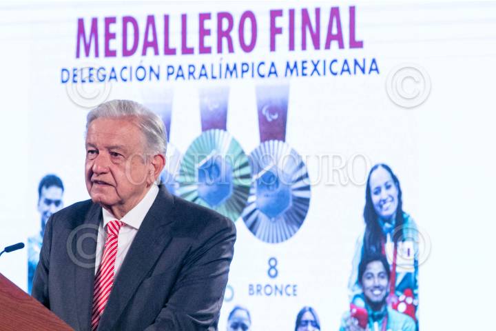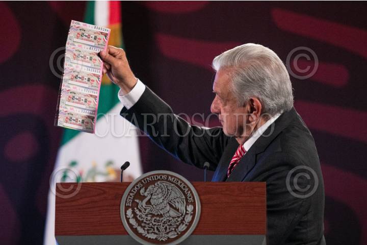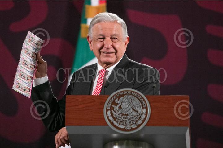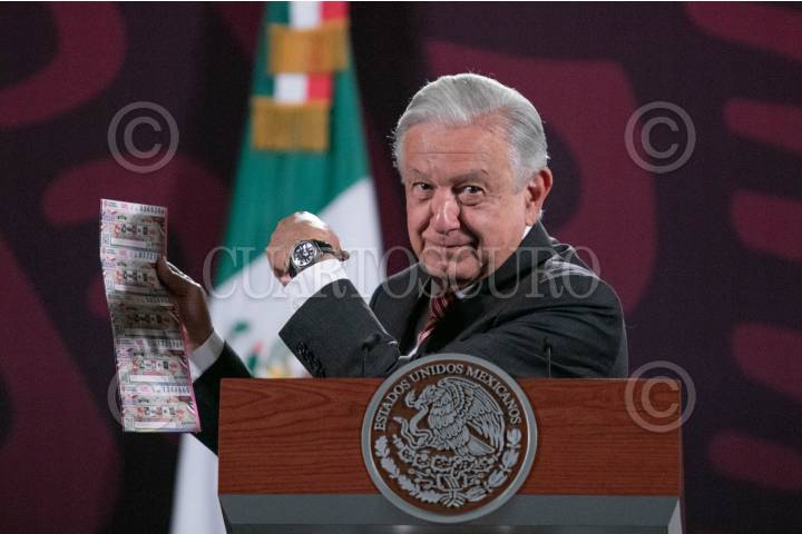 CIUDAD DE MÉXICO, 09SEPTIEMBRE2024.- Andrés Manuel López Obrador, Presidente de México, mostró un billete de la Lotería Nacional que rifará el premio mayor de 40 millones de pesos este 15 de septiembre. También mostró su reloj que anuncio rifará en su última conferencia matutina. Anuncio de los premios que recibirán los ganadores en los Juegos Paralímpicos de París 2024. FOTO: MOISÉS PABLO/CUARTOSCURO.COM