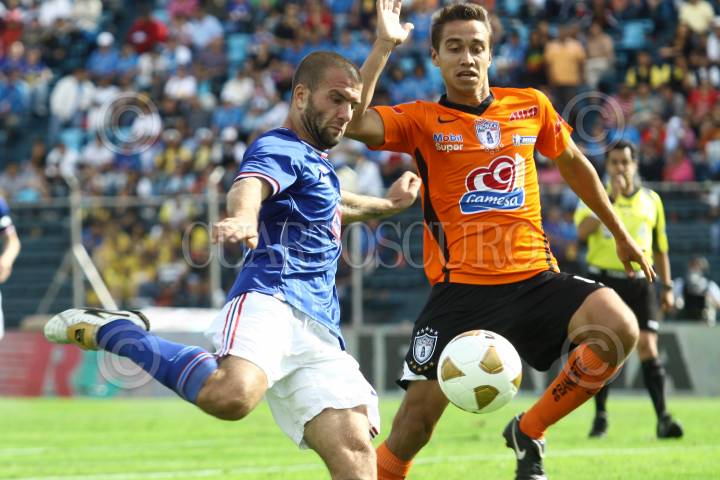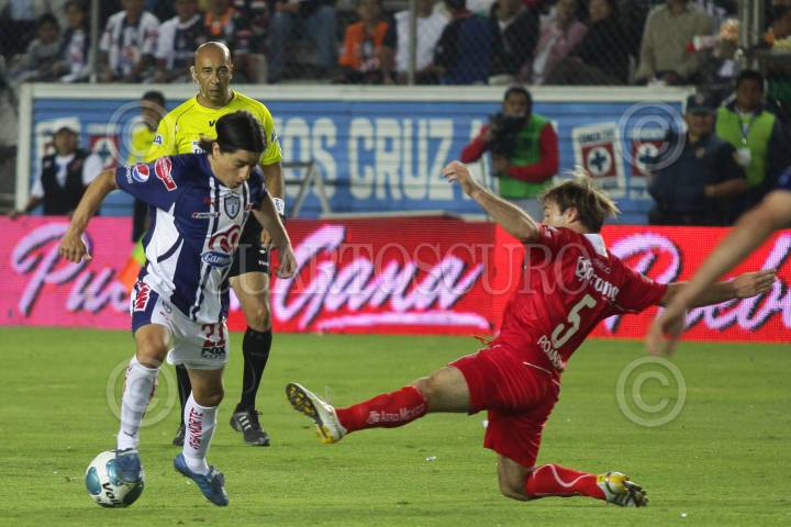 PACHUCA, HIDALGO, 12MAYO2010.-Damian Manso de los tuzos del Pachuca busca rematar en contra de los Diablos del Toluca durante el partido de ida de las semifinales del torneo Bicentenario del fútbol mexicano que se realizo en el estadio Huracán quedando empatado a 2 goles. FOTO: RODOLFO ANGULO/CUARTOSCURO.COM