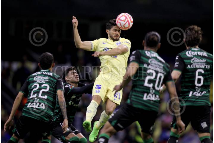 Remate de Henry Martín durante el partido de fútbol América vs Santos correspondiente a la jornada 5 del Torneo Apertura 2022 de la Liga BBVA MX, en el estadio Azteca.
