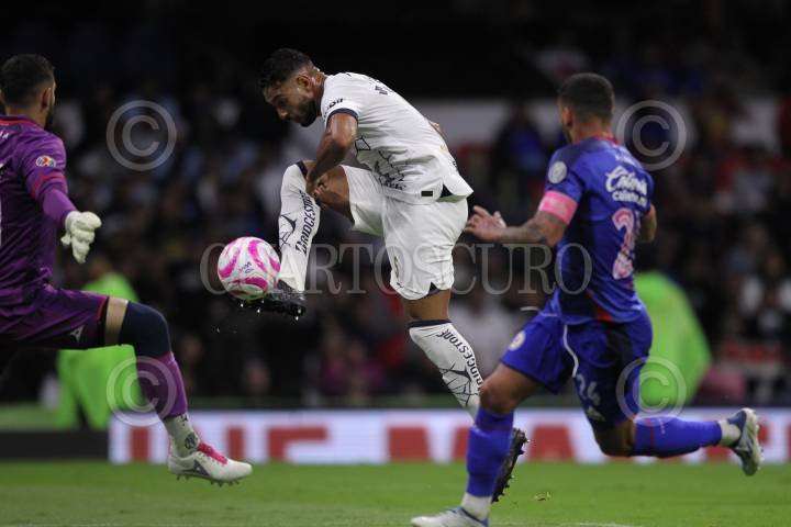 CIUDAD DE MÉXICO, 07OCTUBRE2023. Remate del jugador Nathanael Ananias que terminaría por ser el cuarto gol de los Universitarios durante el partido de fútbol Cruz Azul vs Pumas correspondiente a la jornada 12 del Torneo Apertura 2023 de Liga BBVA MX en el Estadio Azteca. FOTO: EDGAR NEGRETE/CUARTOSCURO.COM
